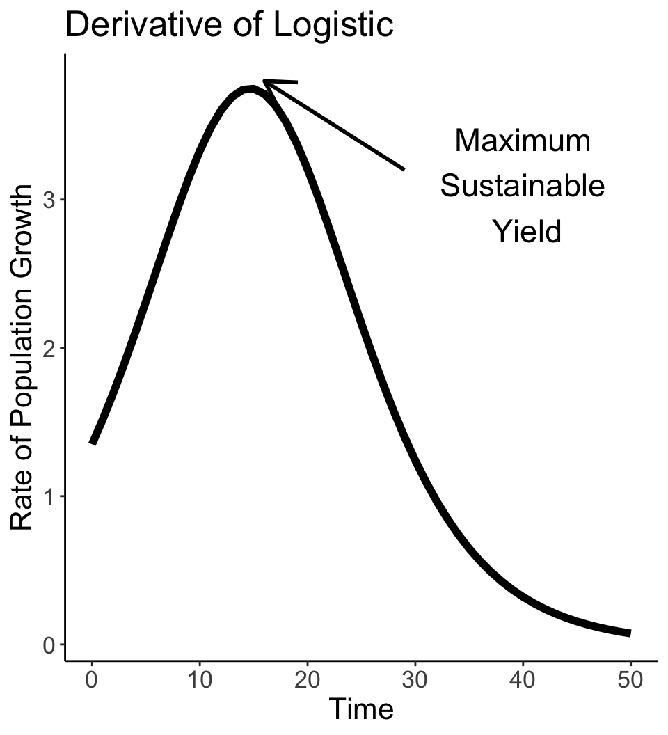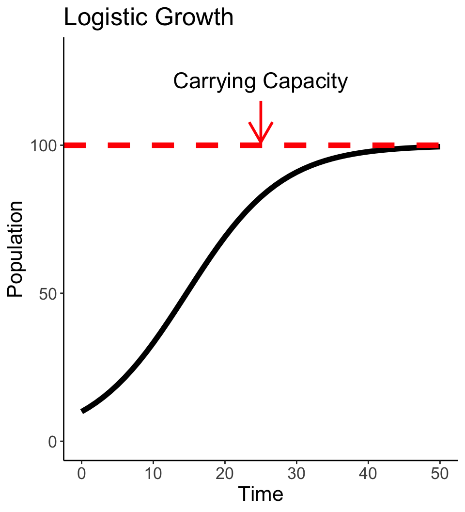 where \(N=\text{population, }r=\text{growth rate, }t=\text{time, and }K=\text{carrying capacity}.\)